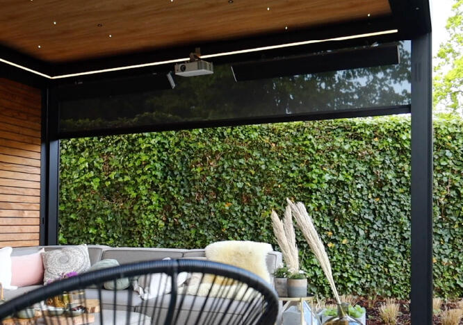 La Pergola à toile enroulable Z!P se caractérise par son toit incliné et ses gouttières discrètement intégrées dans les poteaux. Savourez pleinement votre espace extérieur à l'abri.